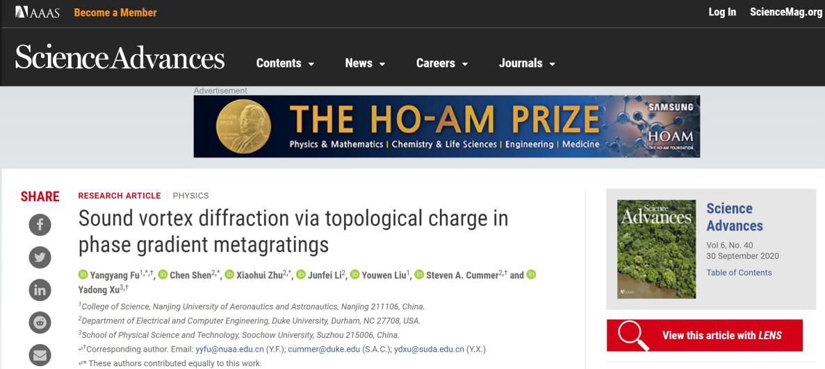 近日,理德州扑克的玩法 应用物理系伏洋洋副研究员和刘友文教授与美国杜克大学的S. A. Cummer教授以及苏州大学的徐亚东教授合作,在声学轨道角动量研究方面取得重要进展,提出利用相位渐变超构光栅实现操控声学轨道角动量的新机制:声涡旋衍射机制。研究团队设计并实验上验证了一种不对称声涡旋传输器件,该器件在基于声学轨道角动量通信方面具有极大的应用价值。相关成果以 “Sound vortex diffraction via topological charge in phase gradient metagratings”为题发表在Science子刊《Science Advances》杂志上。伏洋洋副研究员为论文的共同通讯作者和第一作者,杜克大学的Cummer教授和苏州大学的徐亚东教授为论文的共同通讯作者。