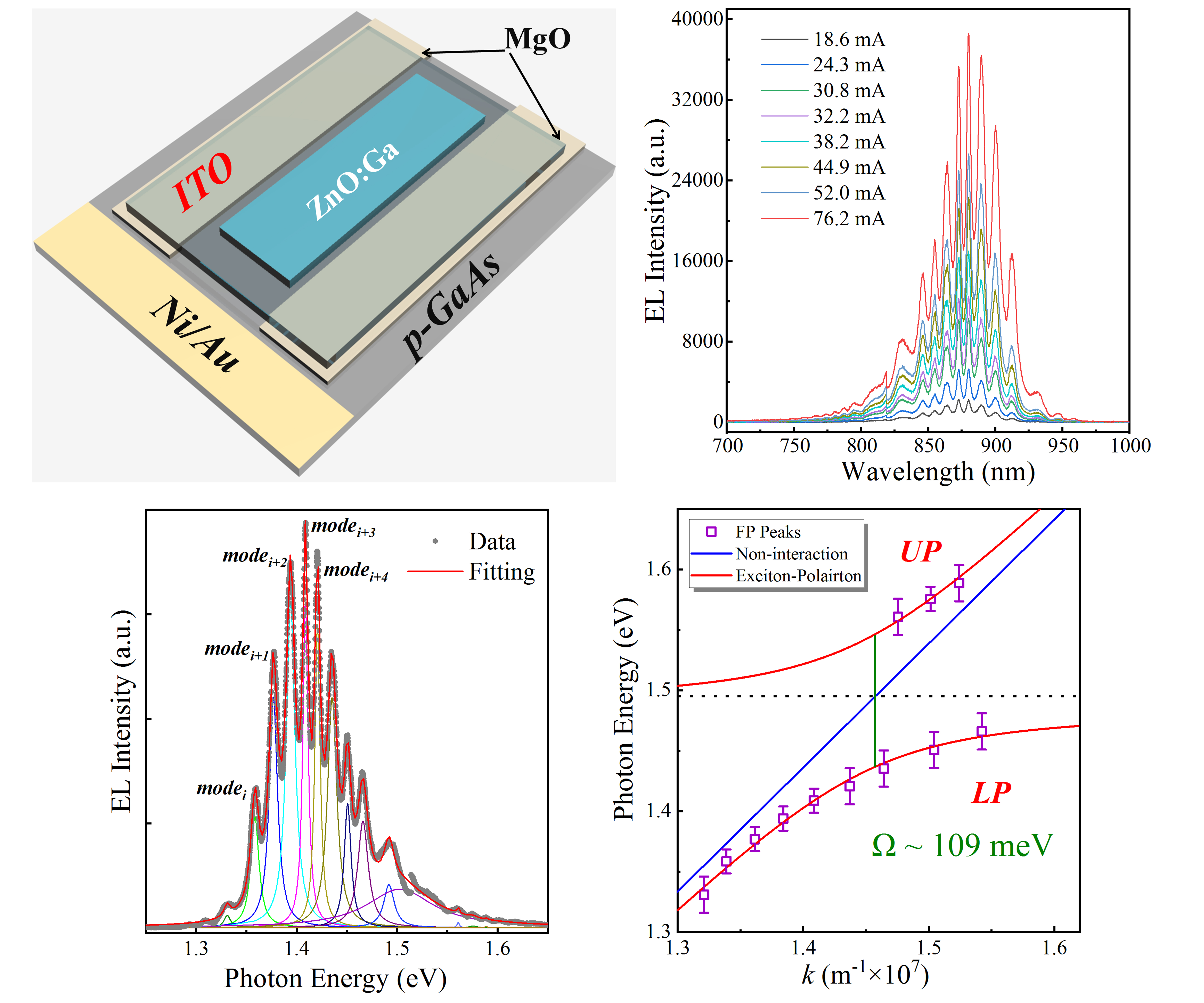 本研究工作依托阚彩侠教授课题组(光电功能材料、器件与物理课题组)平台,在实验上采用化学气相输运沉积实验方法合成了ZnO:Ga微米带,结合p型GaAs衬底构建了n-ZnO:Ga微米带/p-GaAs异质结。该异质结发光二极管器件可以在近红外波长880nm处发射,光谱半高宽约为55nm。从其电致发光光谱可以看出:光谱由一系列窄的发光峰叠加组成,且可以获得长波范围模式间距展宽现象,表明了微米带近红外LED中可以发生较强的光-物质相互作用,实现了电驱动操作下的激子-极化耦合。实验上制备的单根ZnO:Ga微米带拥有较高的结晶质量,其横截面构筑的Fabry-Perot光学谐振腔能够对发光器件释放的光子形成一定的选择机制,进一步为器件中激子和光子的耦合相互作用提供了谐振腔。通过角分辨电致发光测量的反交叉行为证明了这种的激子-极化强耦合,并估算了相应的拉比分裂能,即激子-光子耦合强度约为109 meV。实验结果为在室温下实现电驱动激子-极化发光二极管提供了可能,也为实现具有低成本、超低阈值的相干光源的制备迈出了有希望的一步。
