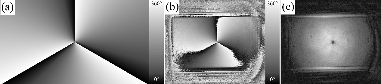 图(a)是空间光调制器的水平和垂直偏振方向的相位差实际分布,图(b)和图(c)分别是测得的空间光调制器表面的相位差和光强的分布。