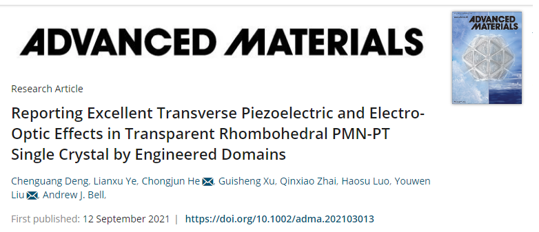 近日,国际顶级期刊《Advanced Materials》(先进材料,IF:30.849)在线发表德州扑克的玩法理德州扑克的玩法 团队的研究成果“通过铁电畴工程实现具有优异横向压电和电光效应的透明PMN-PT单晶”,该论文第一作者为理德州扑克的玩法 博士生邓晨光,理德州扑克的玩法 刘友文教授和航天德州扑克的玩法 赫崇君副教授为论文通讯作者。