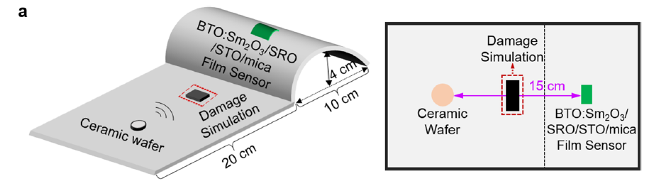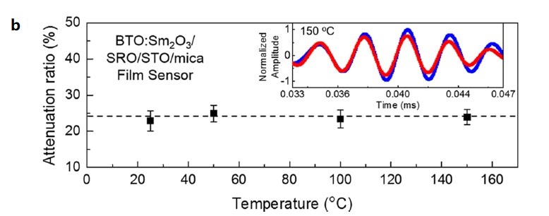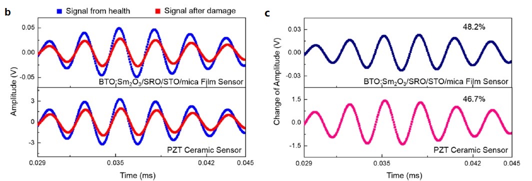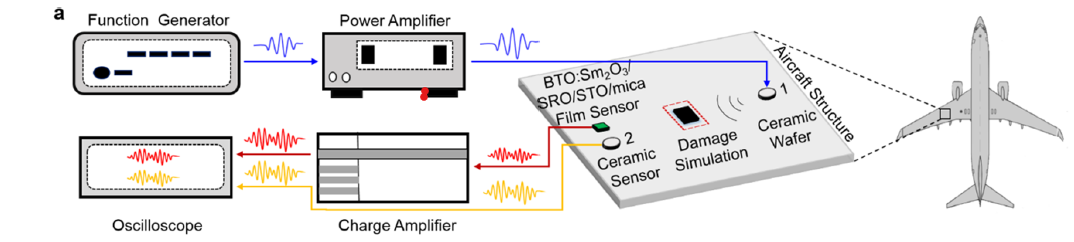 BTO:Sm2O3/SRO/STO/mica传感器可以替代刚性陶瓷PZT压电传感器用在飞行器的弯曲结构件上,接收Lamb波信号。并且在室温到150°C范围内都可以正常工作。