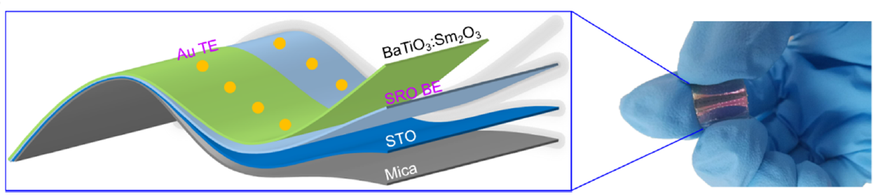 图1 左图:BTO:Sm2O3/SRO/STO/mica传感器示意图;右图:15μm厚柔性云母基底的复合薄膜传感器。