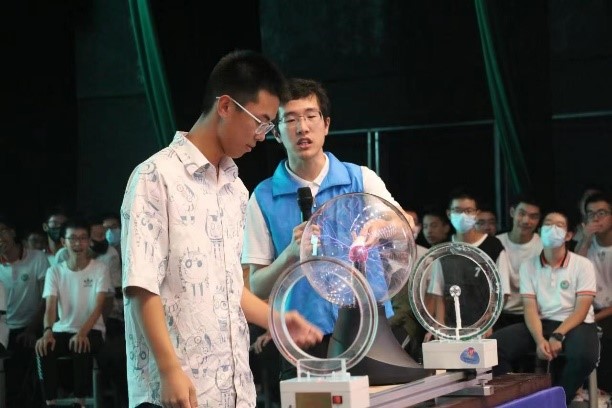 “爱益科普”讲解团成员向现场学生重现了辉光球、浮沉子、无线充电等三个经典物理实验。讲解团成员讲述了经典实验的“前世今生”、实验原理及在各个应用领域发挥的作用,同时邀请中学生上台感受实验,激发了现场学生对物理的兴趣。