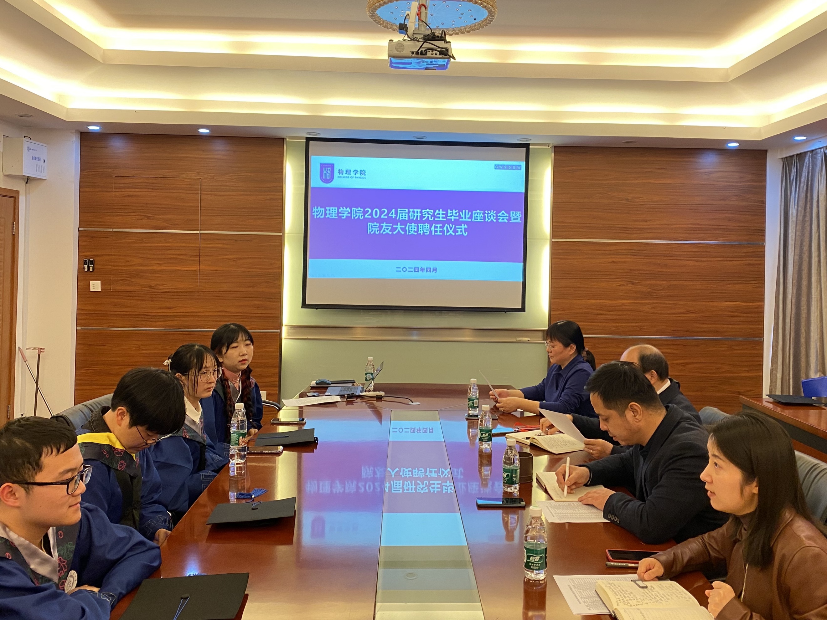 4月1日上午,物理德州扑克的玩法 2024届研究生毕业座谈会暨院友大使聘任仪式在理学楼517会议室举行。德州扑克的玩法 党委书记陈修文、院长刘友文、党委副书记欧珊、副院长阚彩侠、德州扑克的玩法 研究生教育管理工作组成员以及全体2024届毕业生参加此次座谈交流。会议由欧珊主持。