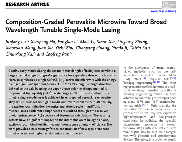 物理德州扑克的玩法 光电功能材料器件与物理研究团队卢俊峰副研究员与东南大学徐春祥教授、北京航空航天大学潘曹峰教授合作,利用气相阴离子交换方法制备了卤素组分沿长轴方向呈梯度渐变的CsPbClxBr3-x微米线,为构建宽范围、波长连续可调谐新型激光器同时提供了必要的光学增益介质和谐振腔。相关成果以“Composition-Graded Perovskite Microwire Toward Broad Wavelength Tunable Single-Mode Lasing”为题在线发表在光学顶级期刊《Laser&Photonics Reviews》上。卢俊峰副研究员为第一作者和通讯作者,硕士研究生何小朋为该工作共同第一作者,东南大学徐春祥教授、北京航空航天大学潘曹峰教授为共同通讯作者。