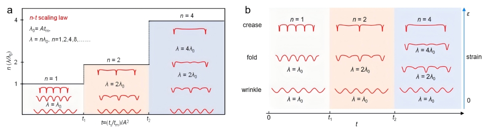 基本内容:基于系统的实验研究,孟彦成发现并证实薄膜的模态变化(失稳阶次)完全由薄膜参数本身决定。具体而言,任意双层膜体系,薄膜变形的最终模态(失稳阶次 n)由两层膜所有参数耦合而成的复合参数 t 唯一决定,且二者之间存在类量子化的台阶式依赖关系,如图 1a 所示,这就是薄膜变形的标度律。其意味着,只有当薄膜的参数取值达到特定值之后,薄膜变形才会进入下一个阶次(新的模态),否则,不管应变多大,屈曲结构都会永远局限在某一阶次。总结可知,随着应变增大,变形从wrinkle到fold再到crease,应变决定薄膜形态变化;随着薄膜复合参数的增大,最终的变形模态或者最终的失稳阶次从1阶到2阶再到4阶…,材料参数决定薄膜模态变化,如图1b所示。至此,我们给出了统一的薄膜变形图像。