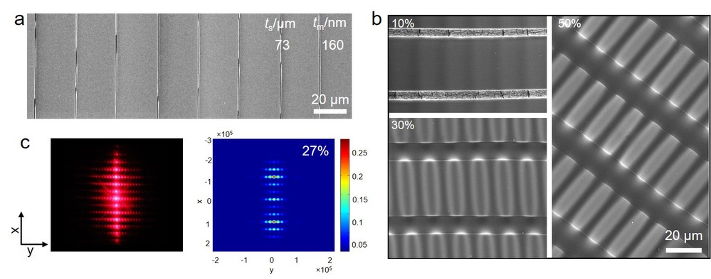 图 3: 正交的矩形与正弦复合光栅。a) 平行等宽的氧化硅薄膜断裂阵列,氧化硅膜沉积在柔性PDMS薄膜上,ts/tm是软/硬膜厚度。b) 垂直断裂方向上拉伸引起的正交正弦与矩形光栅,百分数是拉伸量。c)实验和计算得到的栅衍射花样。