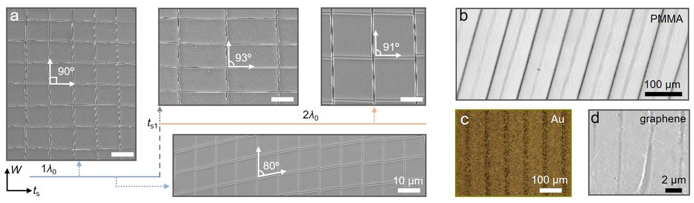 基本内容:将软硬双层膜从硬质基底上垂直剥离,由于剥离弯折导致的挤压作用,弯折区会依照标度律出现一系列屈曲变形,最终的大变形导致硬质薄膜周期化断裂。同样依照标度律,改变软性薄膜参数,即可调制硬质薄膜的断裂周期。基于此,孟彦成实现了软膜表面硬质薄膜断裂的路径控制与周期调制,进一步提出了基于可控断裂的纳米膜裁剪方案。通过两次不同角度的剥离操作,同一硬质薄膜可以被裁剪成诸如菱形、长方形等多种断裂阵列 (图 2a)。另外,结合双层膜体系与剥离操作,精准裁剪了包括单层石墨烯在内的多种硬质薄膜 (图 2b-d)。证实了断裂裁剪的普适性与可操作性。