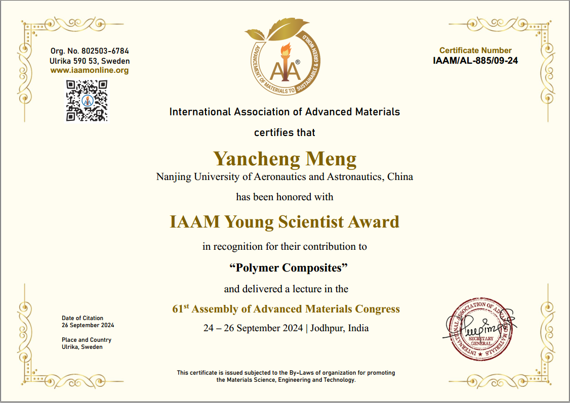 近日,杨浩教授课题组孟彦成副研究员获得瑞典国际先进材料学会 (International Association of Advanced Materials, IAAM)“青年科学家奖 (Young Scientist Award)”,以表彰他在“聚合物薄膜变形”领域做出的重要贡献。并应邀在第61届先进材料大会(61st Assembly of Advanced Materials Congress)做了题为“Universal scaling law for wrinkle evolution in stiff membranes on soft films”的获奖报告。