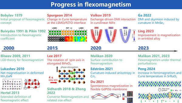 挠曲磁效应是指高阶力磁耦合,涉及磁化与应变梯度的关联。虽然在块体材料中这一效应较弱,但在小尺寸样品中,由于应变梯度可能急剧增大,挠曲磁效应为纳米材料和自旋电子器件中磁性能的高效操控提供了新的平台。本文对挠曲磁效应研究的进展、挑战和机遇进行了前沿综述。首先以狭义和广义的方式定义了挠曲磁效应,重点关注本征挠曲磁效应和表观挠曲磁响应。接着,展示了诱导挠曲磁效应的不同类型的应变梯度、挠曲磁的不同尺度理论模型,以及利用挠曲磁效应操控磁性能的计算和实验进展。然后,讨论了当前关于实验结果与计算结果之间的不一致所引发的争议和挑战,以及现有模型假说的局限性。最后,对未来挠曲磁效应研究的前景提出了一些建议。该综述加深了对挠曲磁效应的理解,给出了未来挠曲磁效应值得关注的研究方向,展现了挠曲磁在自旋电子器件中的应用潜力,有利于推动基于应变梯度工程的新型自旋器件的设计与研发。