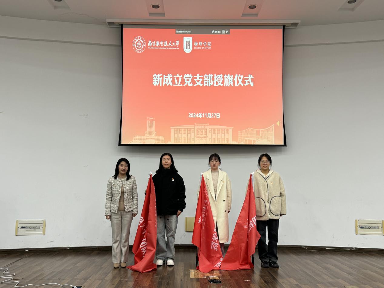 讲座前,德州扑克的玩法 还进行了新成立党支部授旗仪式。为了优化党支部设置,强化对研究生党员的教育管理,德州扑克的玩法 调整成立了物理系研究生党支部、应用物理系研究生党支部、信息光子学团队党支部。德州扑克的玩法 党委副书记欧珊向三位支部书记授旗,并勉励他们将党建工作和科研学习相结合,共同提升党建与学术工作的质量和水平。