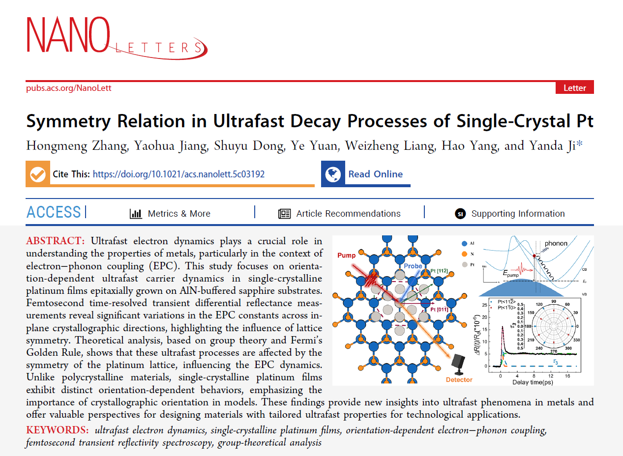 近日,德州扑克规则 杨浩教授团队在金属超快动力学与电子–声子耦合(EPC)研究方面取得新进展。相关成果以《Symmetry Relation in Ultrafast Decay Processes of Single-Crystal Pt》为题,被国际期刊《Nano Letters》接收发表。吉彦达副教授为论文通讯作者,德州扑克规则 德州扑克规则 博士生张泓萌为第一作者。