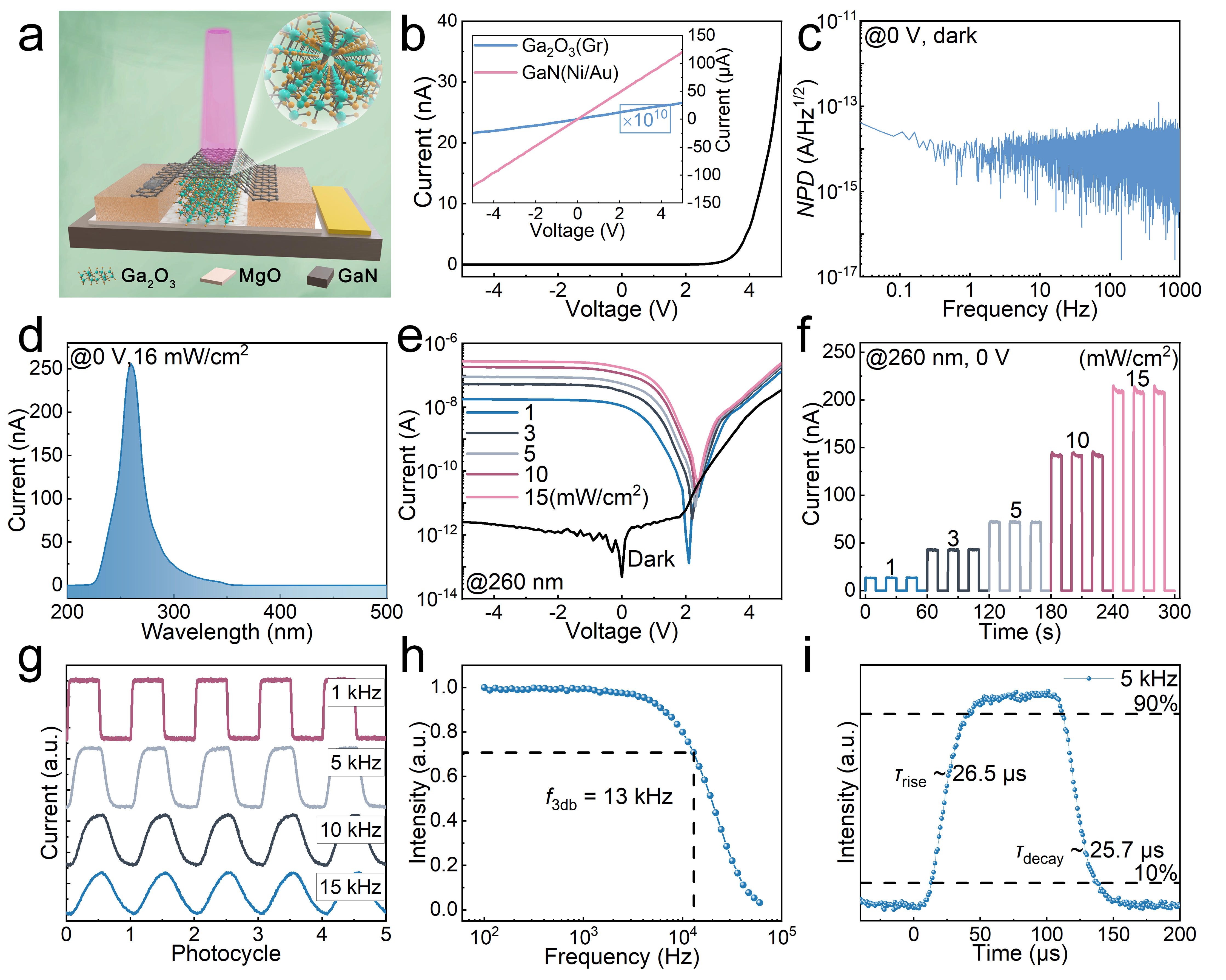 图2:Ga2O3/MgO/GaN范德华异质结光电性能。(a)器件结构示意图,(b)暗电流,插图为两侧石墨烯电极的Ga2O3 MSM 结构与两侧Ni/Au电极的GaN MSM结构的I-V特性,(c)通过时域暗电流傅里叶变换得到的总噪声功率谱,(d)0 V偏压下波长依赖电流,光照强度依赖的(e)I-V曲线和(f)I-t曲线(260 nm 光),(g)不同调制频率下瞬态响应,(h)归一化响应与频率关系,(i)放大单周期响应用于上升/衰减时间估算。
