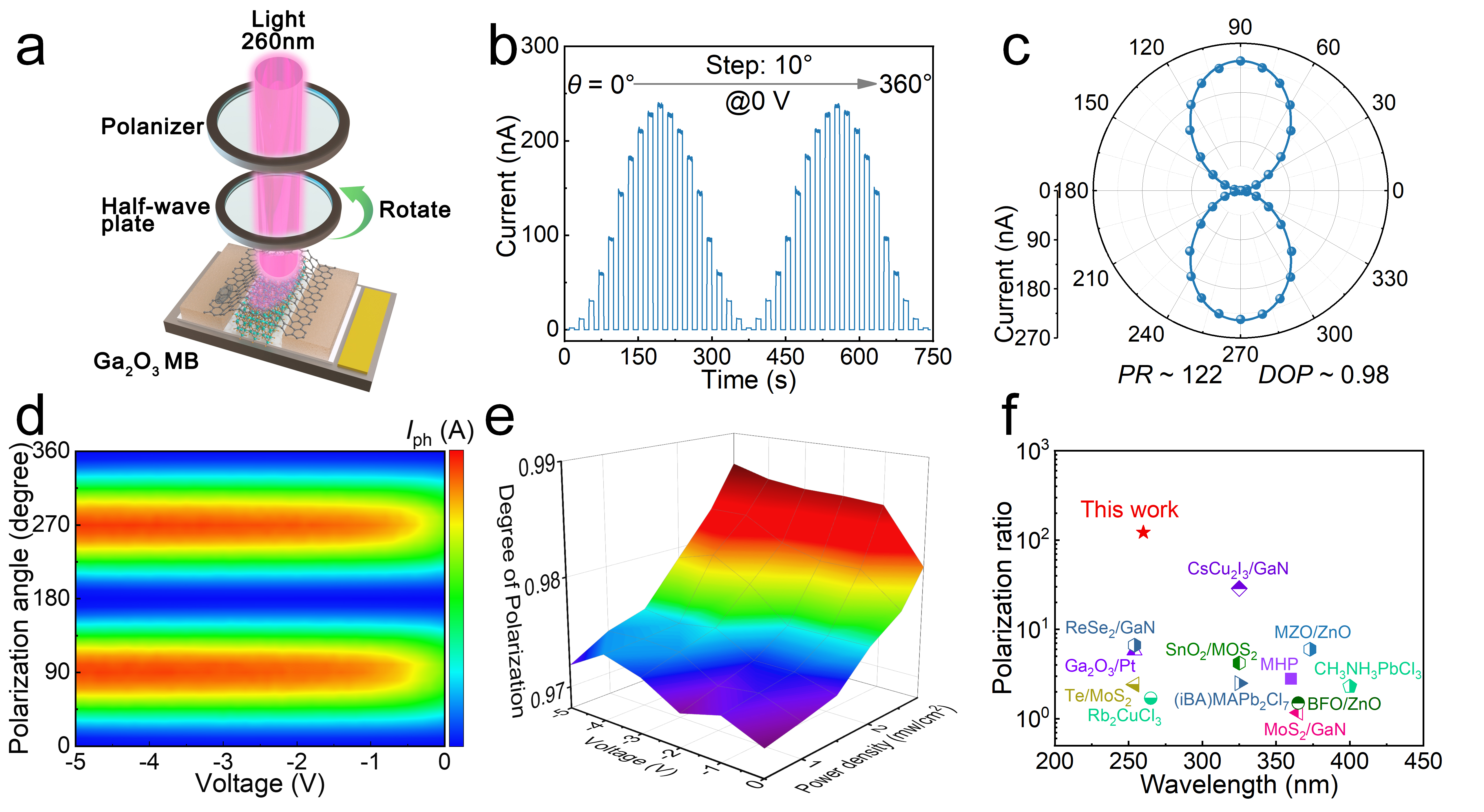 图4:Ga2O3/MgO/GaN范德华异质结光电探测器的偏振特性及性能对比。(a)偏振敏感光电探测示意图,(b)0 V偏压下260 nm线偏振光(偏振角0°-360°)的时域光响应,(c)光电流极坐标图,(d)光电流随偏压和偏振角变化的二维彩色图,(e)偏振度随偏压和入射光强变化的三维图,(f)已报道紫外偏振敏感光电探测器的光响应度对比。