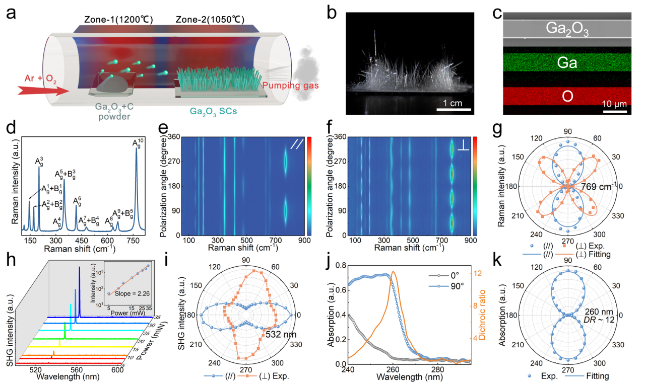 图1:Ga2O3单晶的生长及光学各向异性。(a)生长过程示意图,(b)高分辨率光学图像,(c)扫描电子显微镜图像,(d)拉曼光谱。平行(e)和垂直(f)配置下的角分辨偏振拉曼光谱等高图,(g)769 cm-1处拉曼强度极坐标图,(h)1064 nm 激发下功率依赖二次谐波生成(SHG)光谱,插图为对数坐标下线性拟合,(i)平行和垂直配置下角分辨 SHG 光谱,(j)E//c与E⊥c吸收光谱及二色性比值,(k)260 nm 吸光度极坐标图。