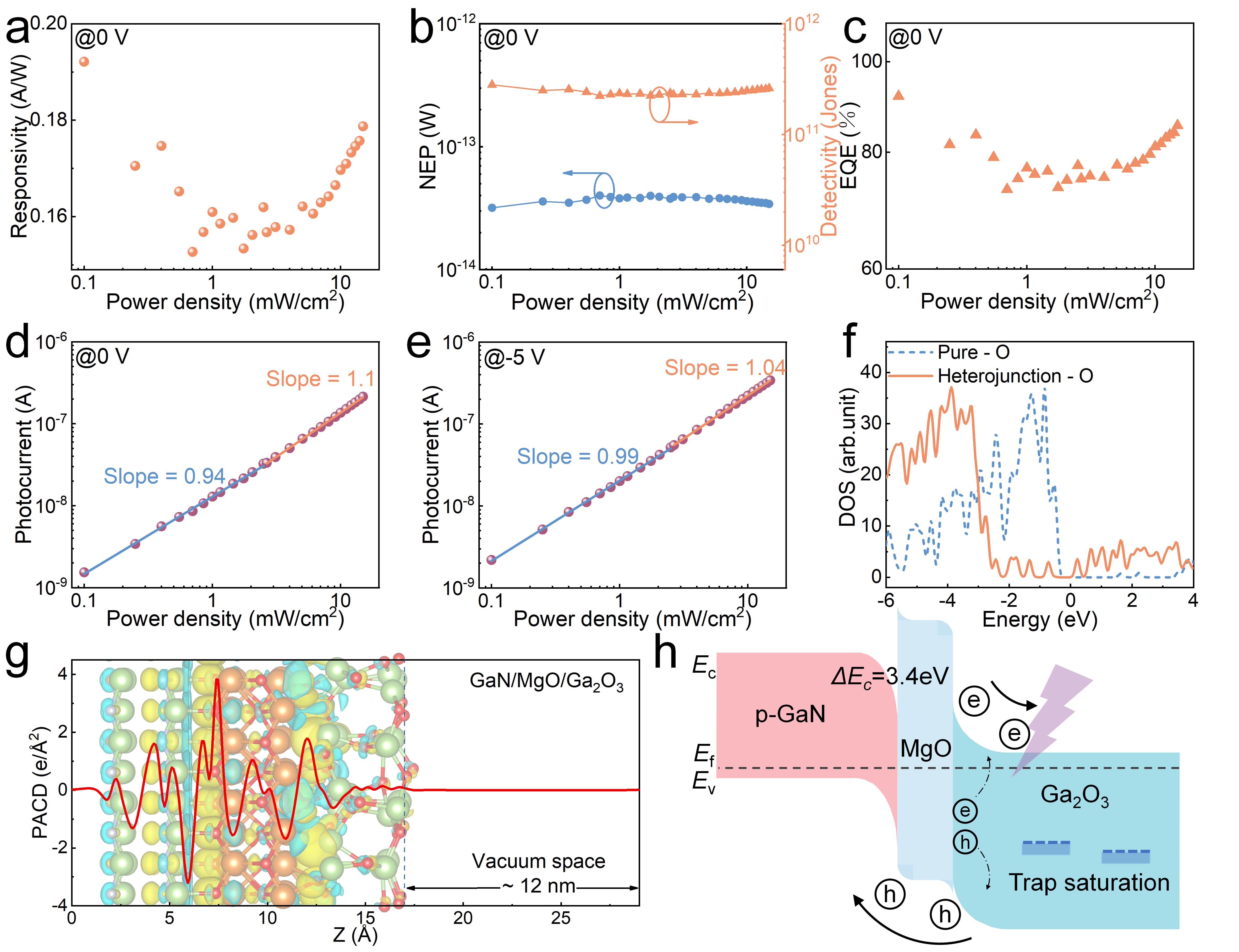 图3:器件的超线性响应及物理机制。(a)光响应度,(b)等效噪声功率及探测度,(c)外量子效率随光功率密度变化,(d)0 V下光电流对数坐标拟合,(e)-5 V下光电流对数坐标拟合,(f)孤立Ga2O3与异质结中Ga2O3的氧态密度,(g)Ga2O3/MgO/GaN平面平均电荷密度,(h)紫外照射下示意能带图。