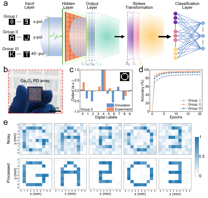 图5:偏振驱动光神经网络的模式识别与图像增强。(a)神经网络结构示意图,(b)10×10 Ga2O3光电探测器阵列,(c)输入图案“O”的模拟输出与实验输出对比,(d)I、II、III 组识别精度,(e)“Noisy”:探测器阵列直接捕获的原始图像;“Processed”:特征提取后的增强图像。